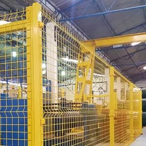 Grades e proteções fixas (em aço, normalmente pintadas em amarelo RAL 1021) para impedir o contato com partes móveis;