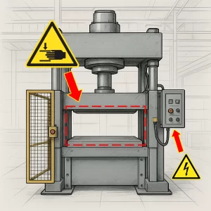 Sensores de presença, cortinas de luz e intertravamentos que bloqueiam o funcionamento da máquina quando há risco;